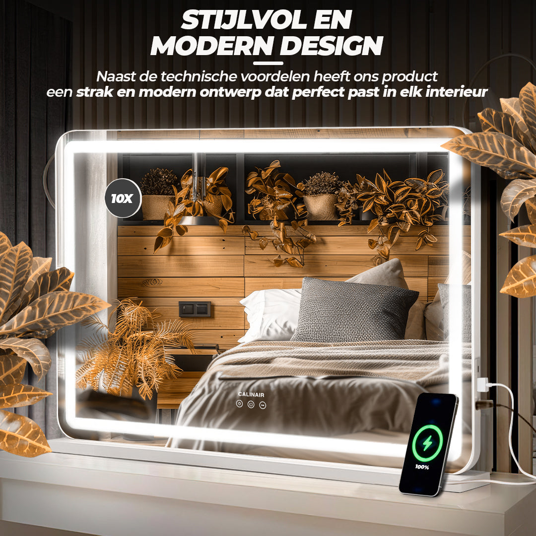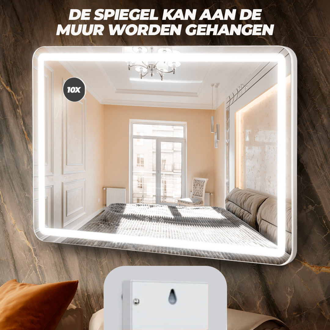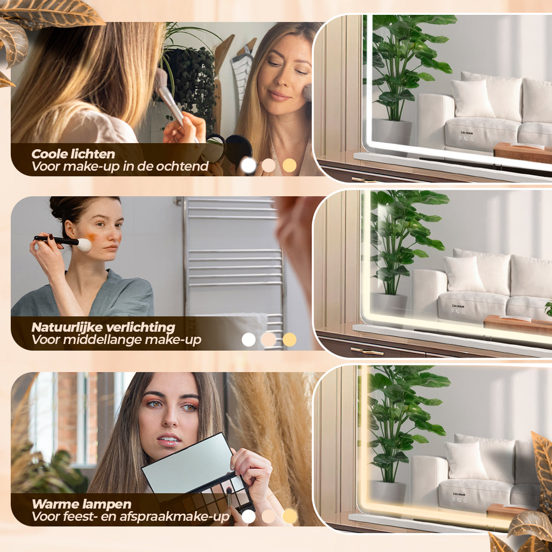 Ervaar professionele belichting met deze luxe make-upspiegel. Voorzien van een dimbare LED-strip met 3 lichtstanden, touchbediening en een 10× vergrotende spiegel. Stijlvol, groot formaat en geschikt om neer te zetten of op te hangen – ideaal voor elke beautyhoek.
