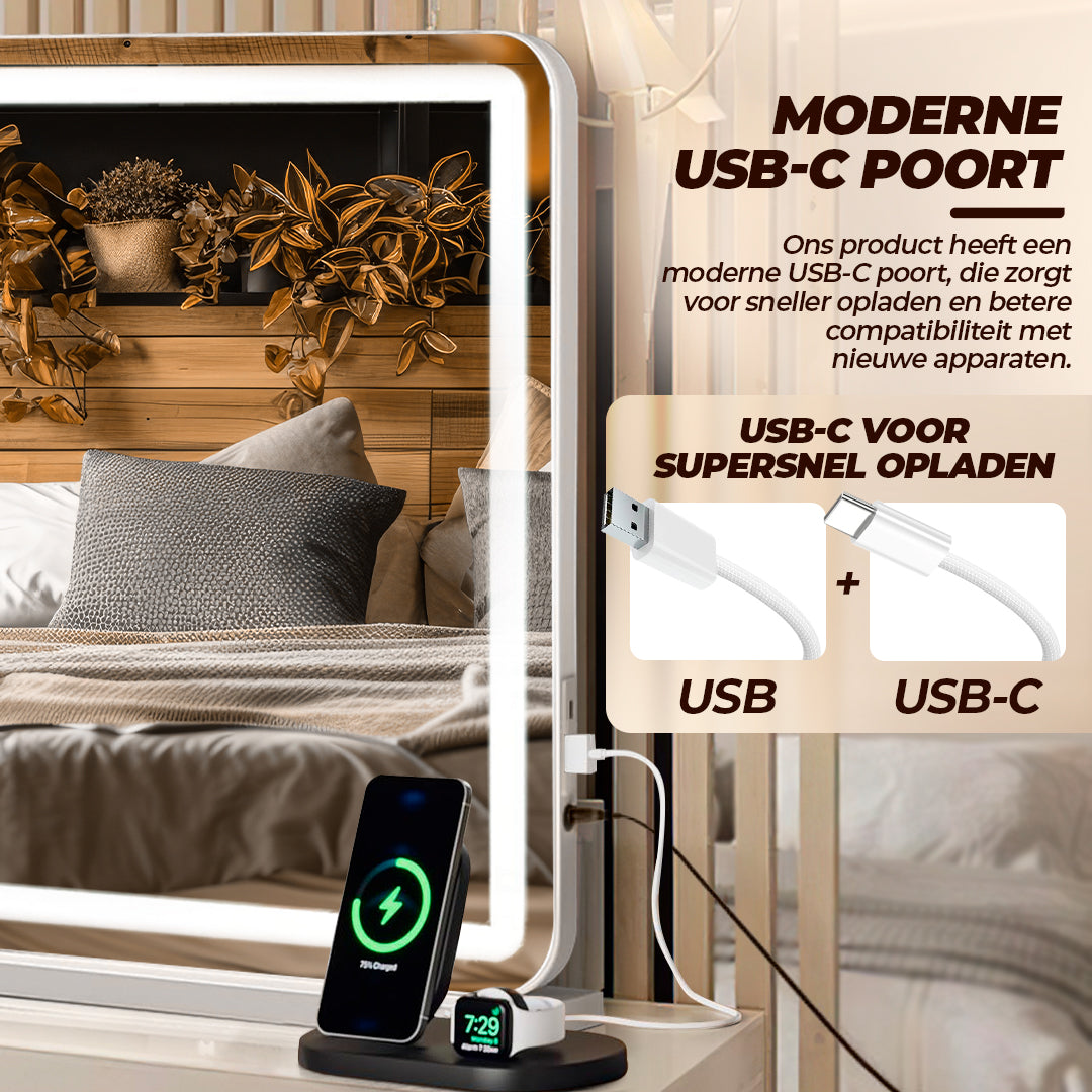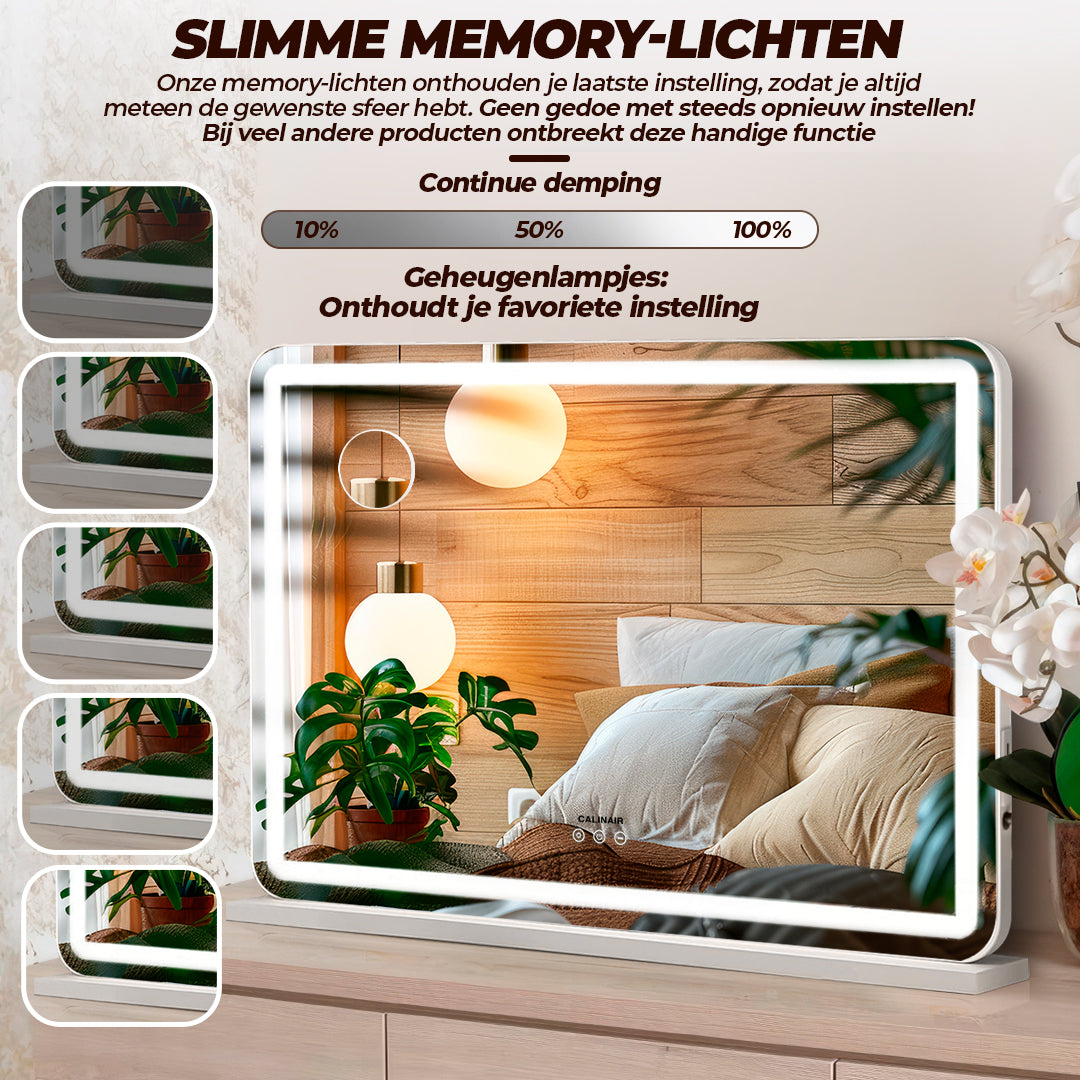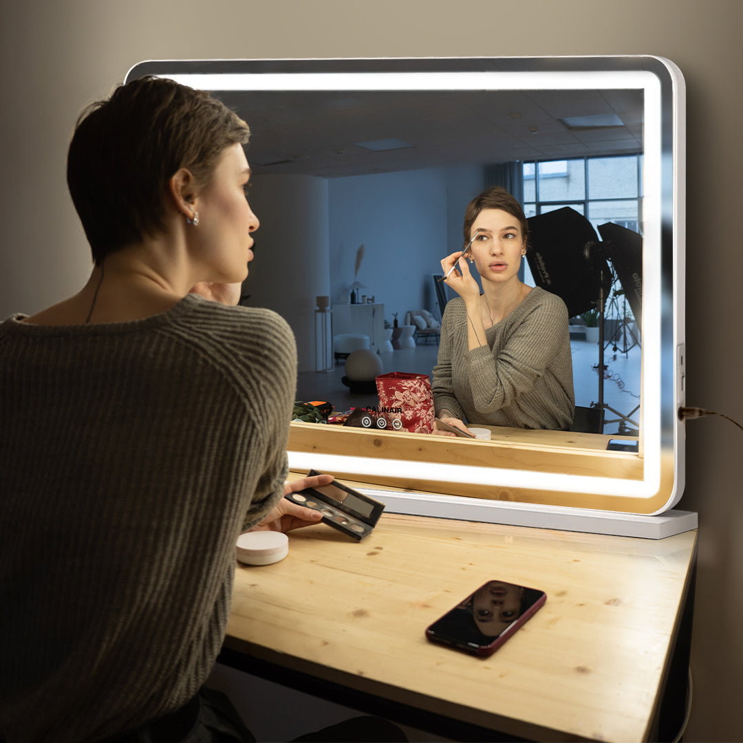 Ervaar professionele belichting met deze luxe make-upspiegel. Voorzien van een dimbare LED-strip met 3 lichtstanden, touchbediening en een 10× vergrotende spiegel. Stijlvol, groot formaat en geschikt om neer te zetten of op te hangen – ideaal voor elke beautyhoek.